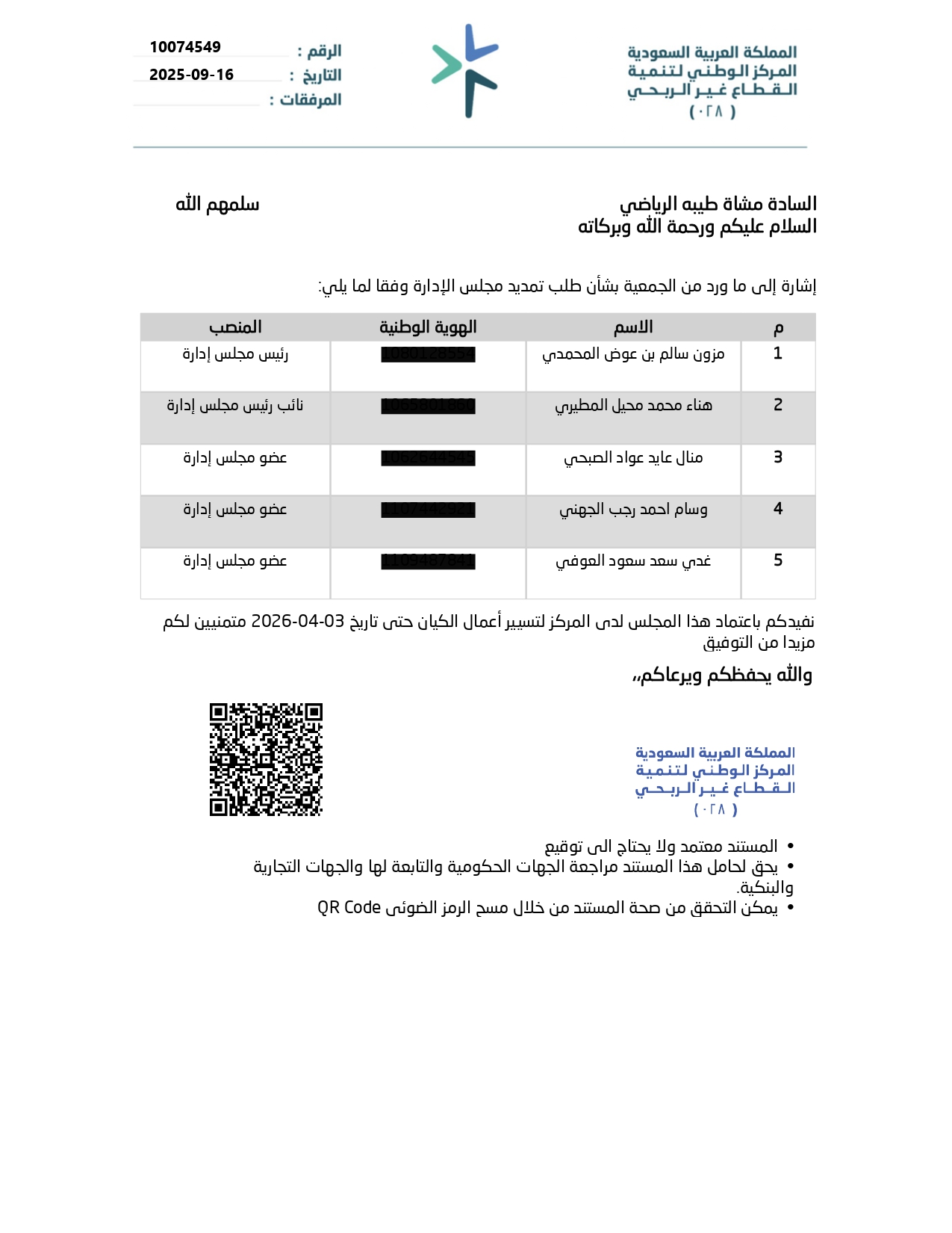" مدة مجلس الادارة ( الدورة الأولى ) 4 سنوات تنتهي بتاريخ 17/04/1447 "